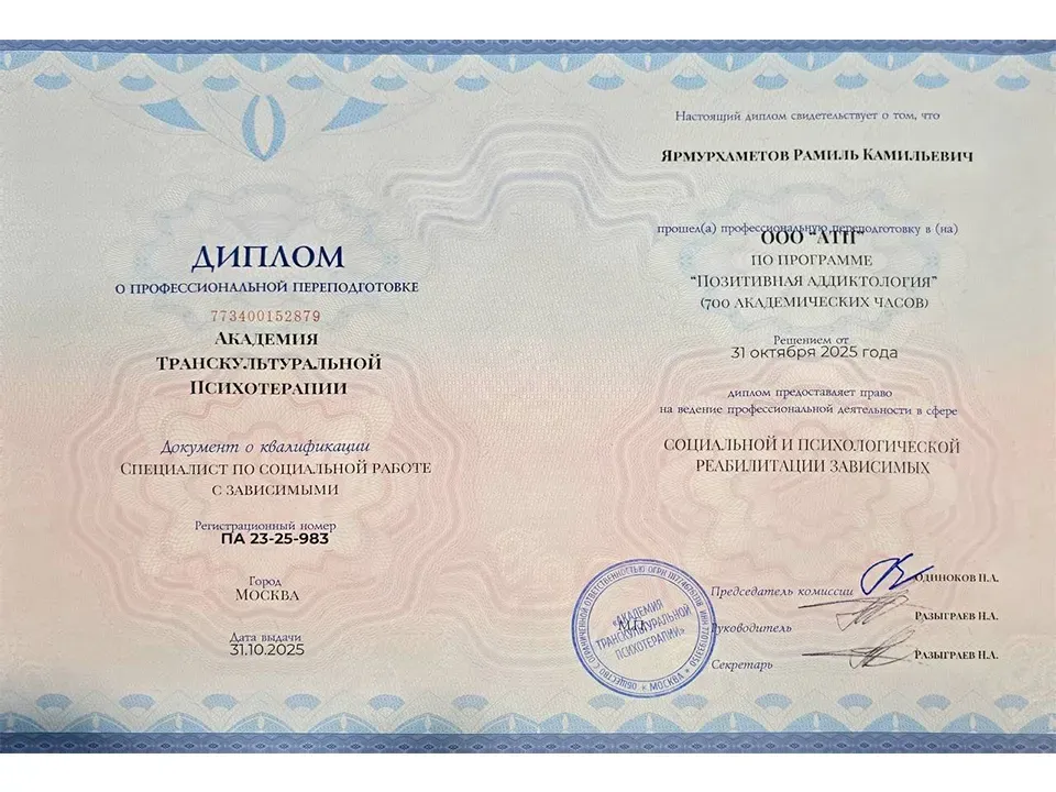 Рамиль Камильевич — специалист по социальной работе с зависимыми, обладающий опытом более 3 лет в сфере помощи людям, столкнувшимся с различными формами зависимостей.